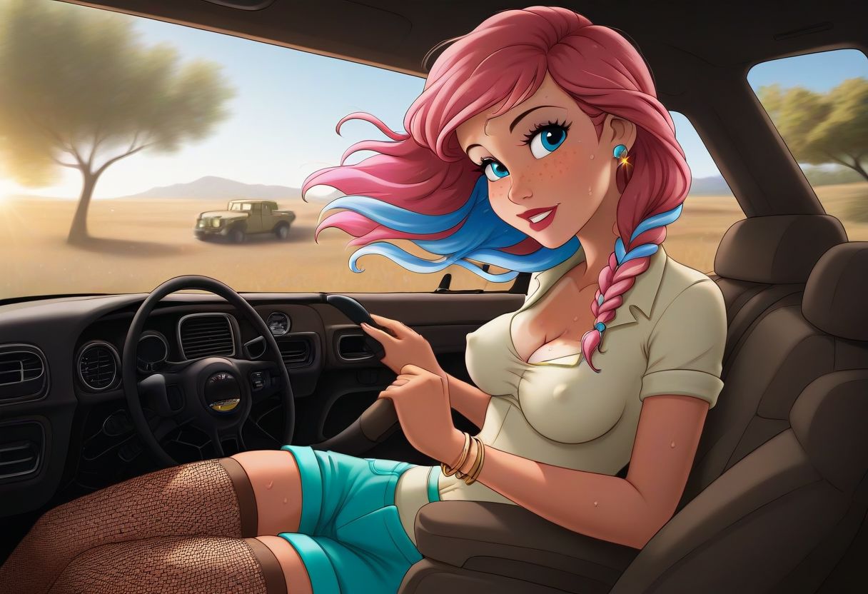 sexy white caucasian girl, blue eyes, sexy, multicolored hair, several streaked pink hair,highly detailed face, long braids, straight bangs, freckles, eyeliner, medium breasts, tight high, small earrings, detailed eyes, bracelet, safari, safari tour in background, tiger-colored bellyfree top, tan lines, sweat, tight hotpants, covered nipples, driving, driving in a jeep, sitting on the backseat of a jeep, driving jeep, open car, wind, flying hair, fishnet stockings, high res image, masterpiece, detailed background,