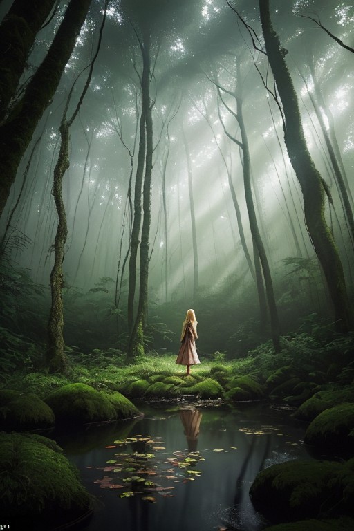 In this photo you will see a blonde elf standing in the depths of the forest. She looks up, as if admiring something invisible in the air. Her hands are lowered, but a stream of plant shoots is streaming out of them, as if they grow from her own fingers. The blonde's hair flutters easily in the wind, adding mystery and elegance to her. The background of the photo is a dense forest where the trees form a dense green carpet. The leaves and branches create a play of light and shadow, adding depth and volume to the scene. In the distance, you can see the sun glimmers penetrating through the foliage, creating a magical atmosphere. This detailed description of the photo captures a moment of magic and mystery, giving it a special appeal. Be inspired by the work of photographers such as Tim Walker and Annie Leibovitz to create your own magical story