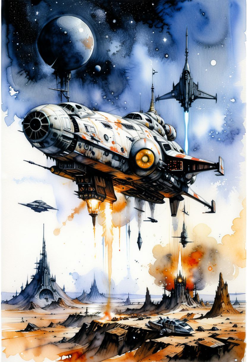 watercolor illustration of p3tr4_morg4n, (art by luis royo) ,spaceship Star Wars
