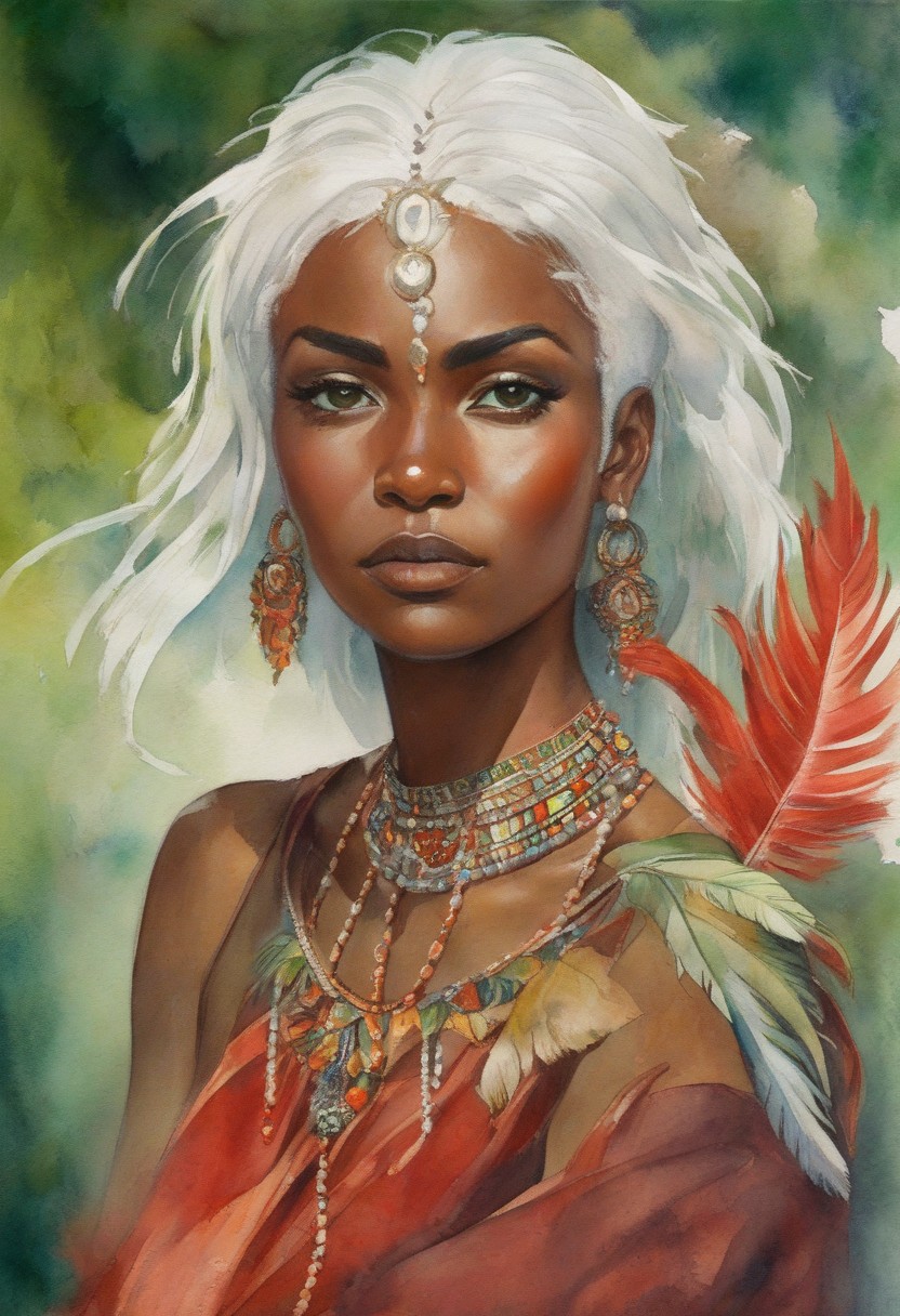 Portrait of desert fairy, pixie haircut, shaman girl, white hair, African style, feather, jewels, savanna, wear red top with floral design, open shoulder and belly, serious face, greg rutkowski, Tattoos on arms, green eyes, watercolor, masterpiece