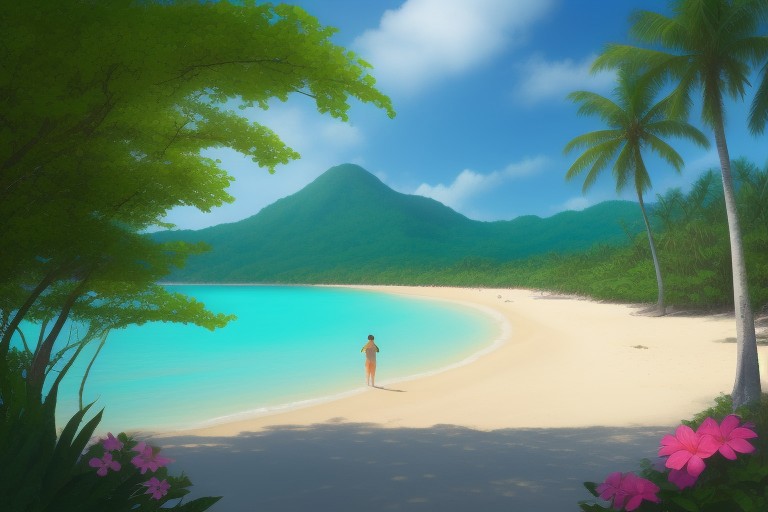 An epic tropical beach with turquoise water and a forest full of flowers.