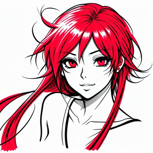 Anime style redhead. white background. Simple lines. Black white red only. Heavy Stroke line. Thick lines. Line art.