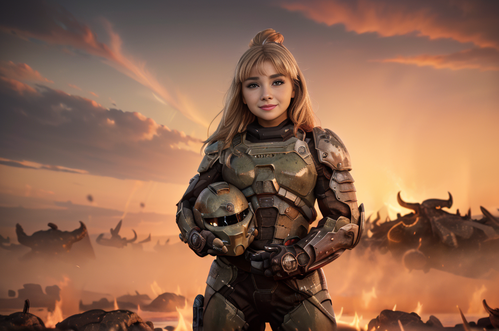 realistic analog photo, award winning photo, wideshot, <lora:Isabelle_Doom_Slayer:0.75> , power armor, energy sword, crucible (doom), hair bell, hair tie, bebahan, blonde hair, brown eyes, long hair, lips, smile, blush, nose blush <lora:bebahan2:1> <lora:Battlefield:0.5> battlefield, outdoors, cloudy sky, scenery, hellscape, burning embers, glowing lava rivers, , high-quality, crisp, sharp, professional-grade, high-resolution, fine detail, accurate colors, low noise, fast shutter speed, wide dynamic range, precise focus, RAW, highres, 8k, uhd, High Dynamic Range, tonemapping, crisp details,