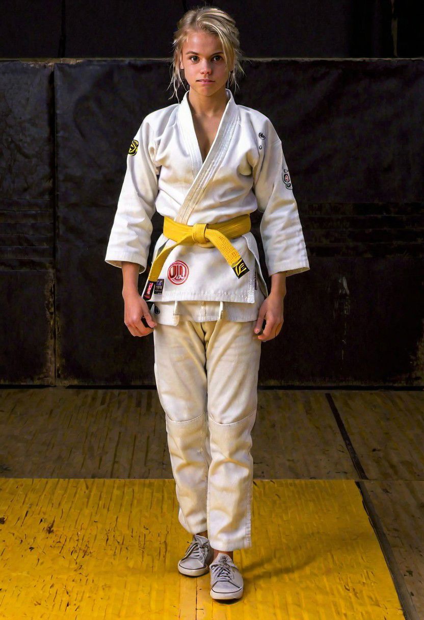 (((jp-j3d-2250))), Oil Painting. ((detailed)), Full (Side) shot of (short, stocky girl). (pretty girl), standing and getting ready to grapple, alone on floor in small private dojo with olive judo mats, weapons hung on the wall, exhausted smile, twinkling eyes, fair skin, ((extremely sweaty skin)), Very short wavy vanilla-blonde side-swept bob-cut hair with undercut and pigtails. dimples. clavicles. upturned small chest. torpedo breasts, Navel. Disheveled. High-quality ((half-open white judo top)). wearing long white Judo pants. ((yellow judo belt)), Hand squeezing one breast. ((One breast exposed)). small dark nipples. (((sneakers))), Dimly lit from one side. Very Dark background. Backlight glow. Candid. Facing to one side. 80mm f/6, 1/100s, ISO 25, golden hour light,
