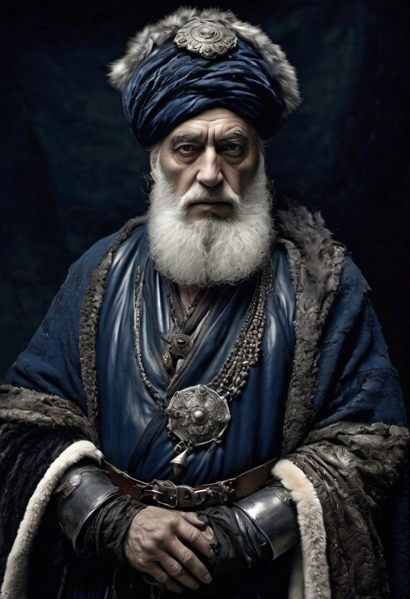 Melchior the Biblical Magi King, occidental, asiatic, white beard, old man, heavy leather armour, dark blue and silver robe, he wears a turban, he wears a fur capeline, he wears a long cape, relaxed standing pose, dirty black coal arms and hands, grotesque environment, extremely beautiful, by Joel Peter Witkin