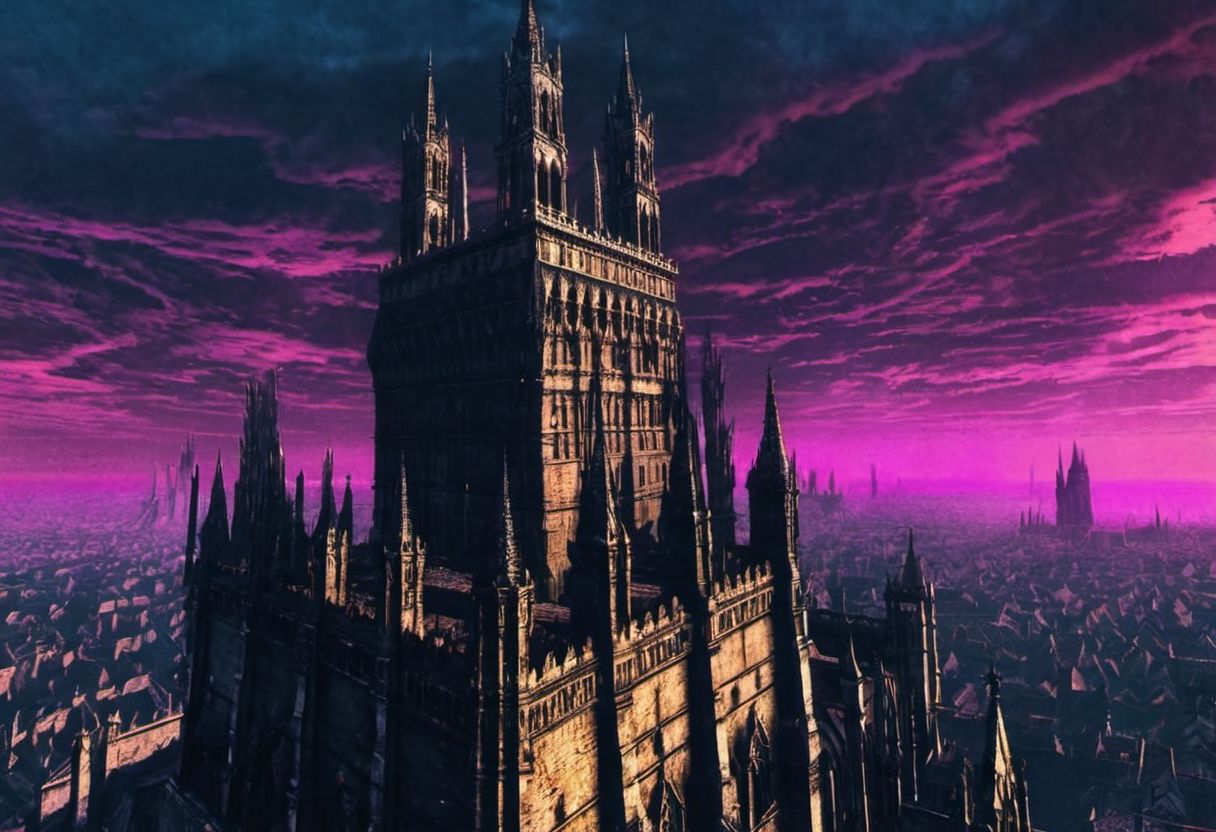 dark souls, synthwave, gritty old photograph, panoramic, anor londo