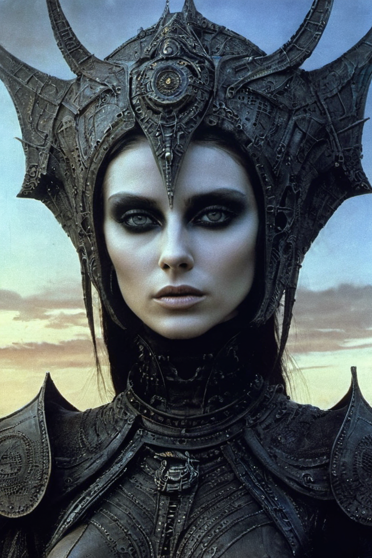 beautiful survivor lady with stunning eyes, strange shapes in the sky, post-apocalyptic, druid, fantasy, dungeons & dragons, h.r. giger, ZdzisÅaw BeksiÅski, mad max, lady