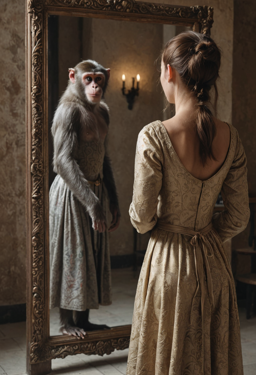 photorealistic:1.2, 8k RAW photo, Back view of ((a human girl)) in a medieval style dress standing in front of a standing mirror, a smile ((monkey)) in the mirror is wearing a dress and facing forward