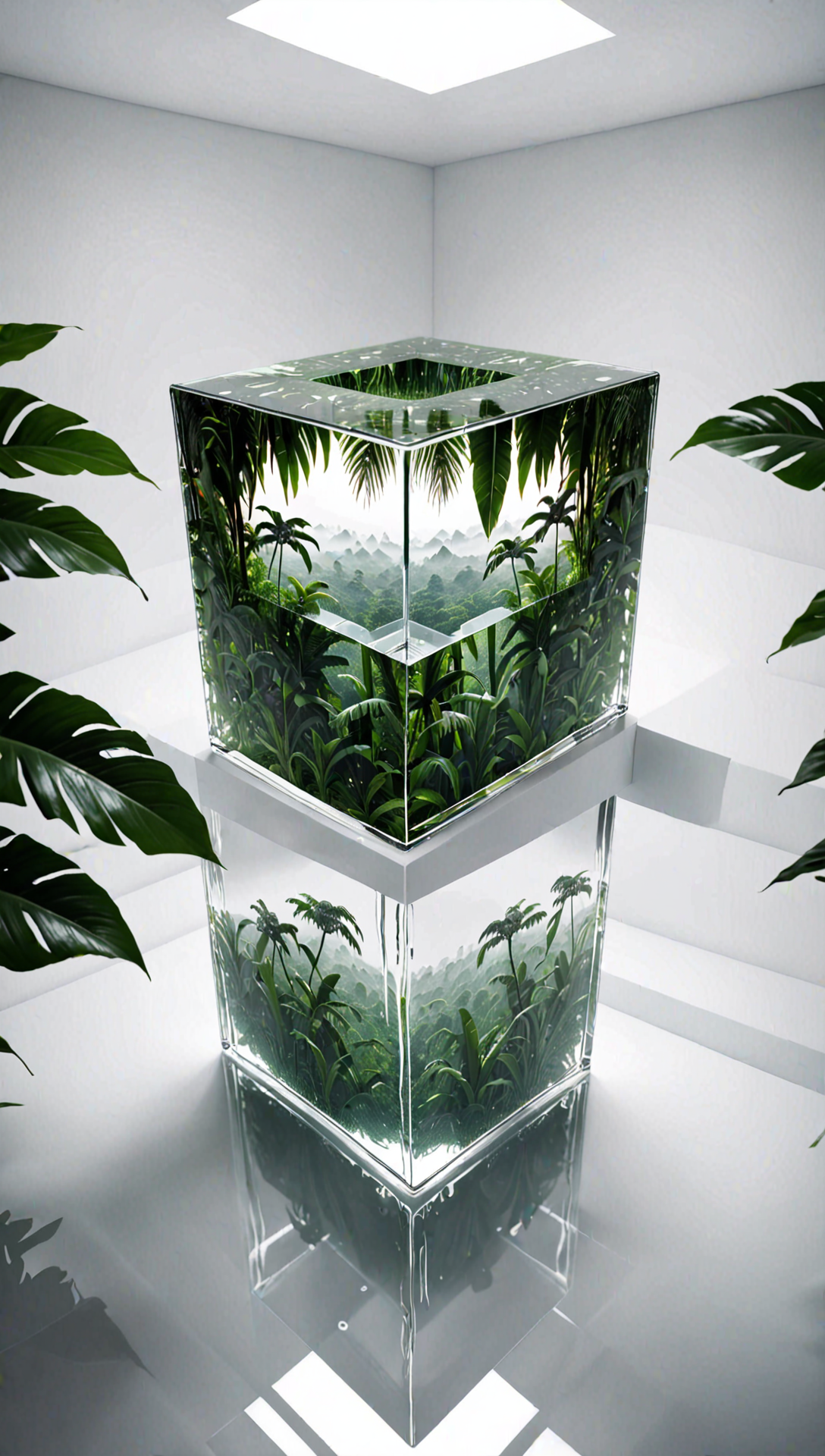 surreal photo, masterpiece, jungle in a 3 dimensional cube, sitting on white floor that stretches on forever, amazing details, condensation inside cube, ecosystem inside cube,very clean white shiny floor that stretches into the horizon,