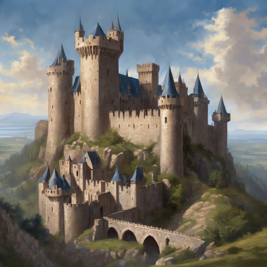 Generate a photorealistic image of a medieval castle, with towering walls and majestic towers, standing tall and proud against a backdrop of rolling hills and a clear blue sky. The castle should exude an aura of power and grandeur, reminiscent of the formidable strongholds of the Middle Ages. The castle should be made of stone, with a weathered and timeworn appearance. The walls should be thick and imposing, with crenellations along the top. The towers should be tall and slender, with pointed roofs. The castle should be surrounded by a moat, with a drawbridge leading to the main gate. The overall impression should be one of strength, majesty, and invincibility.