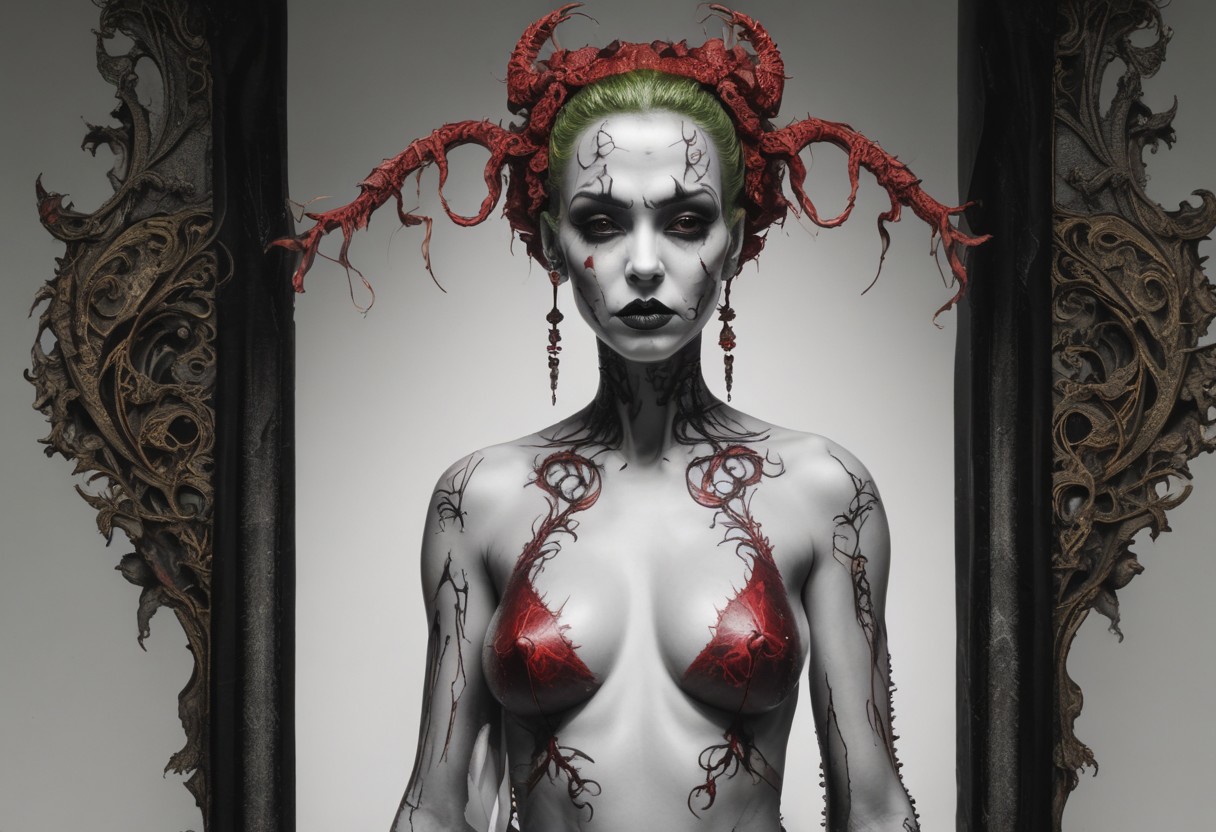 A half body Full body,full length body painting of beautiful highly detailed incorporeal woman with warty, yellowish-green skin, bulbous noses, long, pointed ears, small button eyes, jagged teeth and wearing tattered tight-fitting deep-cut clothes a perfectly symmetrical face and full red goth lips, detailed_eye_model s Beautiful, stunning, windy, y, perfect face, slim athletic body, , rich colors, vignette, moody, dark, epic, gorgeous, magical ,BadDream,fandist