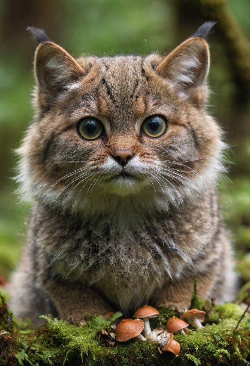 macrophotography, wooded underbrush of moss and mushrooms, (young-Bobcat: 1.29),( mainecoon: 0.59) 8k UHD (cat-eyes) (highest coherency: 1.59) (highest quality: 1.39) (symmetrical) (beautiful-cats-eyes) (Canon EOS R6 Mark II) (Fujifilm X-S20) (vertical-slit pupils: 0.89) (dense underbrush)