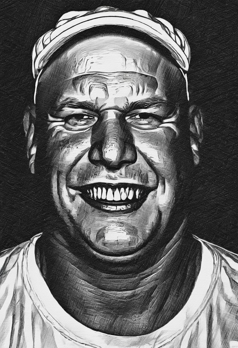 fat male in his 50s, 51 year old male, fat, chubby, ugly male, cook, acne, small eyes, potato nose, kitchen, darkness, evil grin, kitchen knife, stained shirt, black trousers, cook hat, double chin, sharp teeth, gormenghast, black and white drawing, pencil drawing,