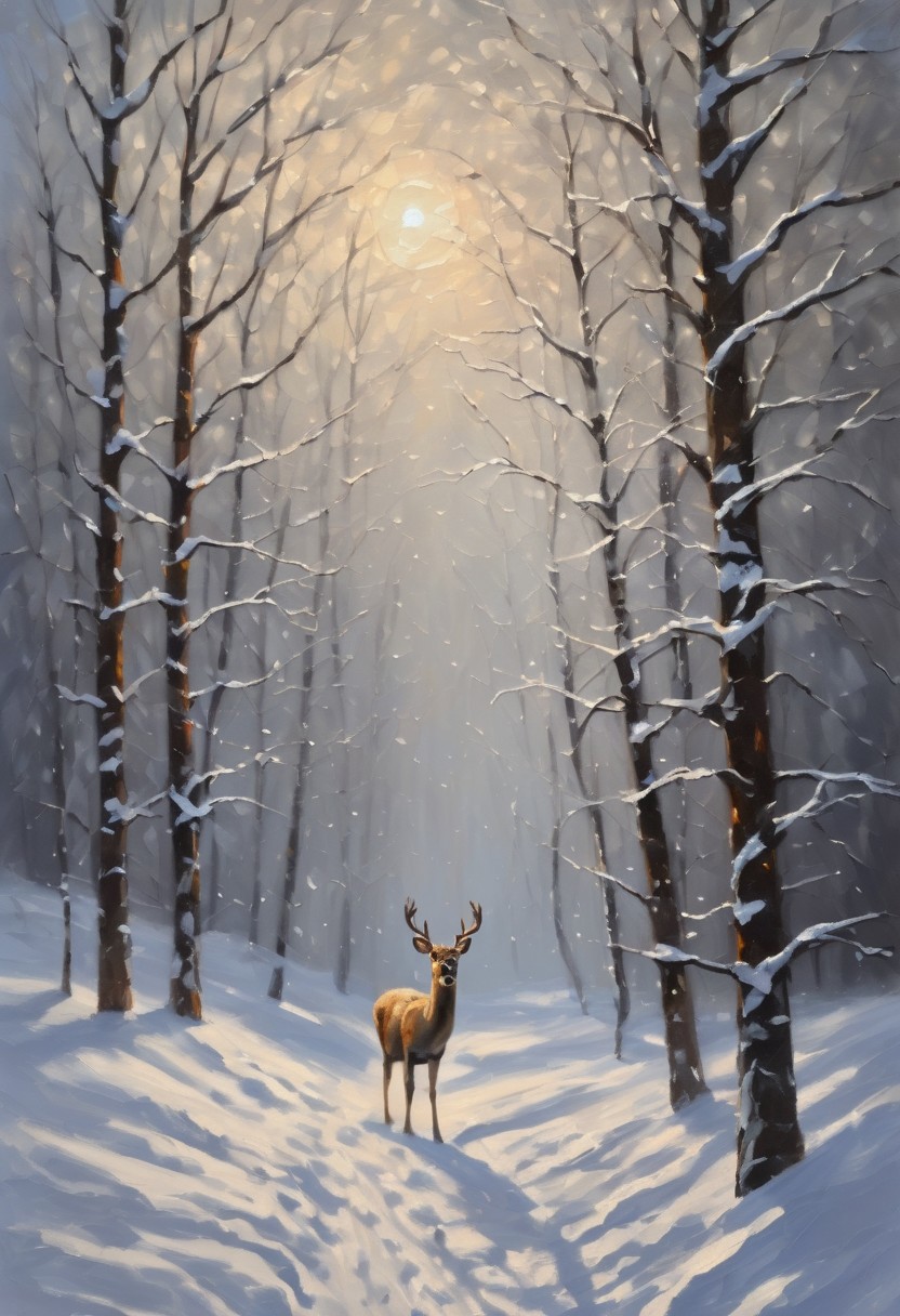 (Deer 3 meter tall, walking on path), snow, scenery, sunlight, footprints, tree, greyscale, cloud, god rays, snow flakes, Masterpiece, acrylic painting, combined palette knife textures with smooth brushwork, cinematic quality.