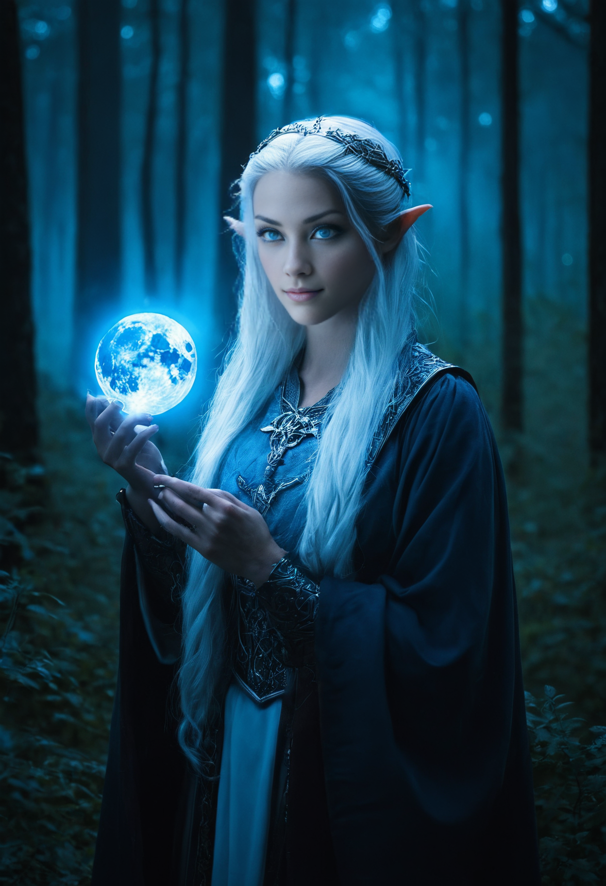 Dreamscape twilight cleric, silver hair, blue eyes, glowing eyes, moonlit forest, female . Surreal, ethereal, dreamy, mysterious, fantasy, highly detailed