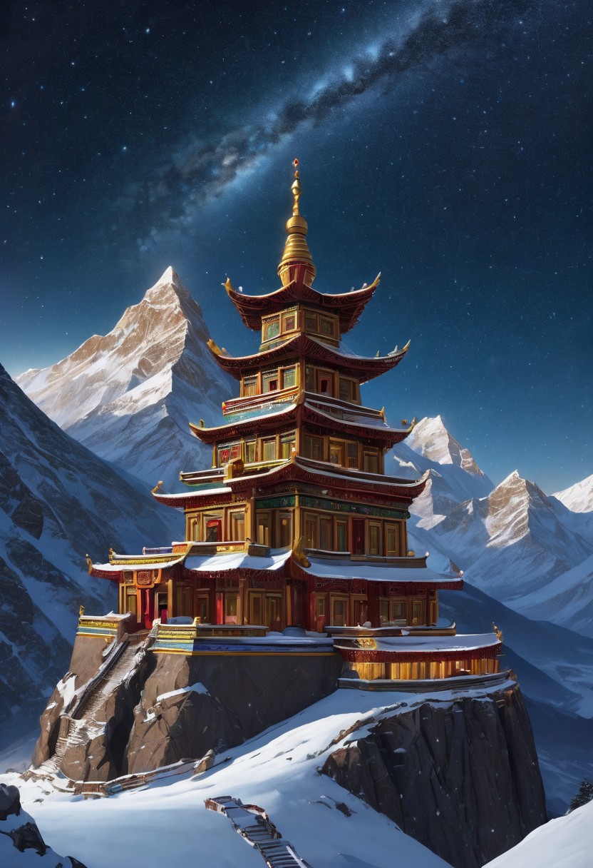 8k, breathtaking, view at the mountain top from below, a tibetan temple surrounded by hig mountains, great sense of scale, (starry sky), view of the stars, masterpiece, highly detailed, undefined, snow, clear sky, style-nebmagic.
