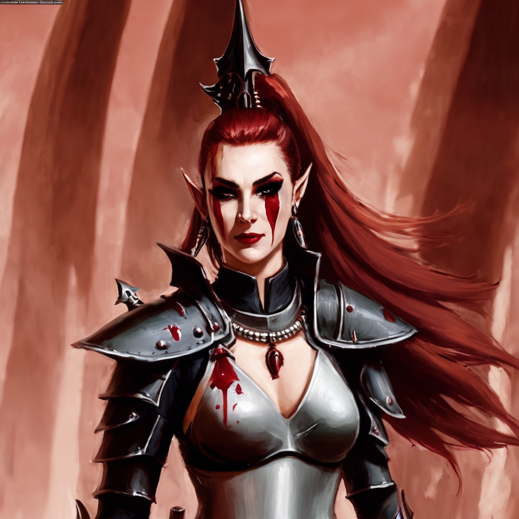 <lora:aeldari_xl_5:1>aeldari, drukhari, standart drukhari, 1girl, solo, long hair, smile, hair ornament, ponytail, weapon, red hair, pointy ears, sword, hand on hip, blood, makeup, knife, lipstick, shoulder armor, pauldrons, breastplate, blood on face, dagger, blood on weapon, armor, drukhari's armor