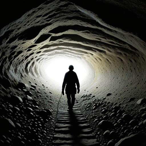Long cavern with a small light in the end, a dark silhouette walking towards the light, back view, illumination, soft white light,