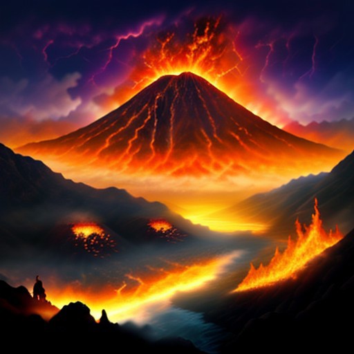 giant active volcano with lava fall coming out of it, lava river in foreground, dark sky, storm clouds, apocalypse, best quality, perfect quality, high res, mountainous back ground, cowboy shot of foreground,