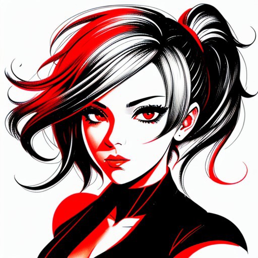 Anime girl. Black and red. Anime style. Duotone only. Black background with shapes. Thick lines. Heavy strokes. Black strong lines. Red highlights. Unfinished.