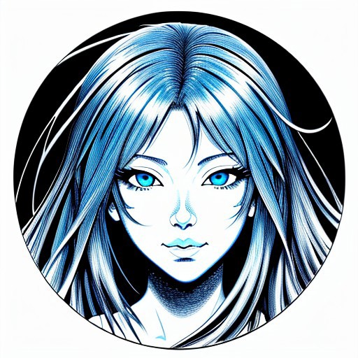 Bluehaired pretty anime girl. Black and white. Blue Eyes. Line art. Very Thick Lines. Fast Lines Metal Art. Esoteric Art.
