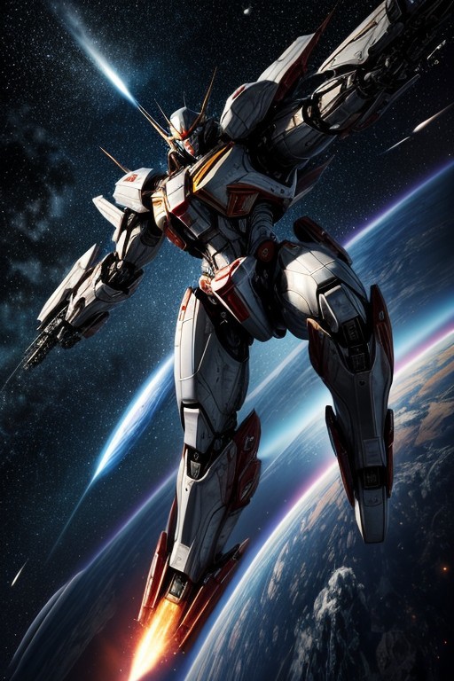 masterpiece, best quality, absurdres, illustration, photorealistic, cinematic, dynamic, mecha, orbital battle, floating in space, starry background, thrusters, cosmic conflict