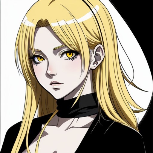 Blonde pretty girl. Anime style. Black and White. Thick strong fat dark black lines. Yellow highlights. Yellow eyes. ESOTERIC ART