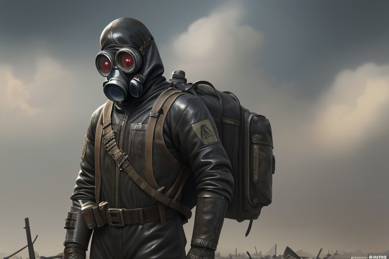 apocalyptic scenery, man wearing gas mask and a leather suit, red eyes, concept art, highly detailed, 8 k