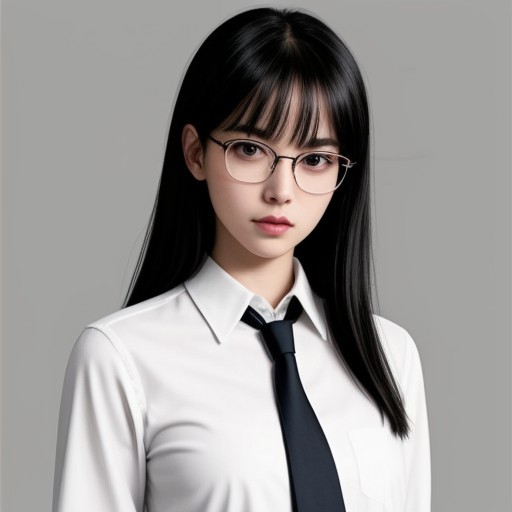 1girl,necktie, solo, school uniform, long hair, mole, mole under eye, looking at viewer, striped necktie, upper body,simple background, hayakawaak, black hair, grey eyes, white shirt, glasses, large breasts, bangs, sleeves rolled up,