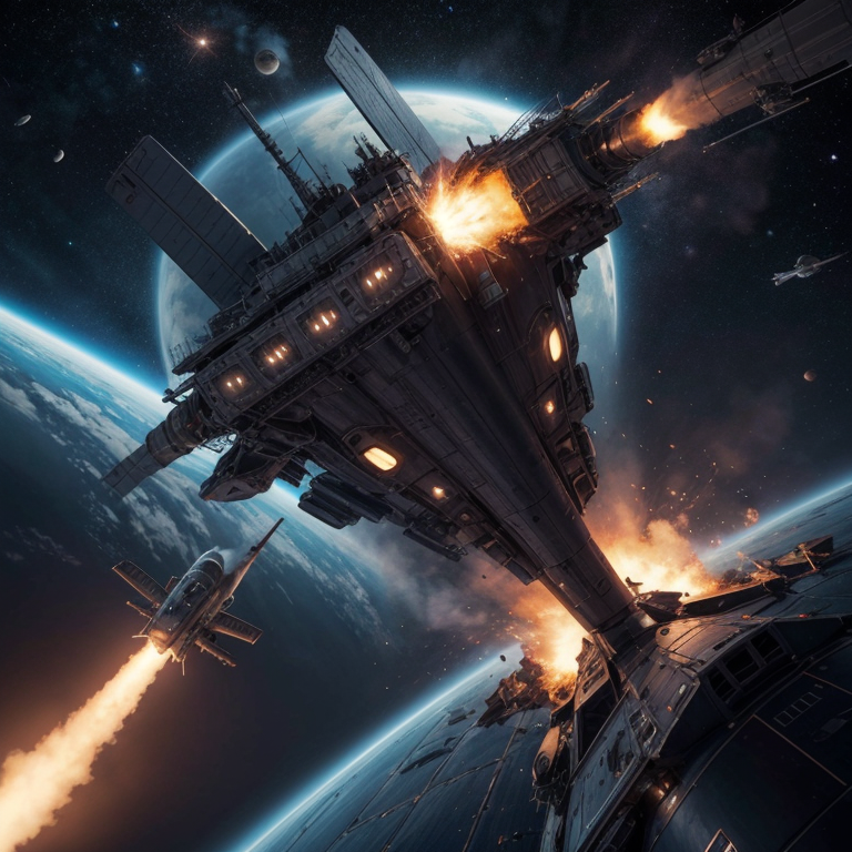 Describe the current situation of a military spaceship frigate in orbit around the Earth. The frigate has been attacked by space pirates and has been hit by their missiles, resulting in significant damage and fires throughout the ship. Specifically, the frigate is now emitting smoke and has holes burned into its hull. In response to the damage, escape pods are launching from the frigate to evacuate its crew <lora:add_detail:1>