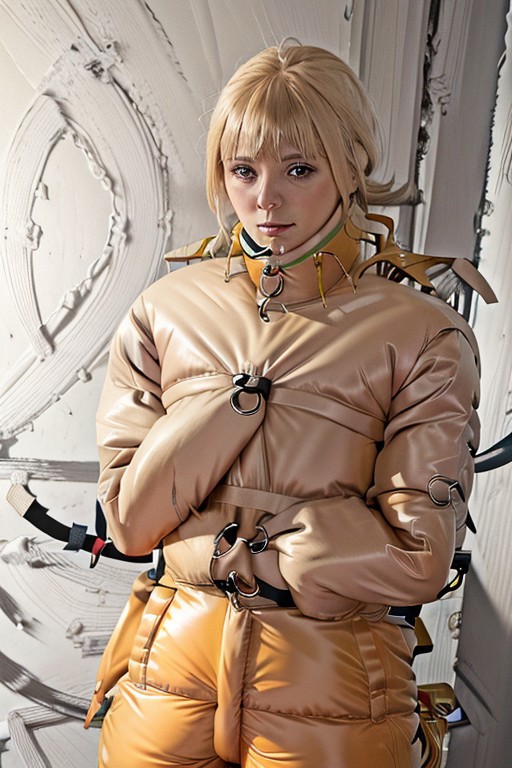 A stunning portrait of an captive, blonde, slim, young girl. she is tied up in a shiny, glossy, hot yellow, ((puffer long straitjacket)), ((puffer coat)),((long coat)), by parkasite. masterpiece, 8k, RAW photo, portrait, best quality, ultra high res, (photorealistic), cinematic indoor lighting, cutest, sweetest. the lighting is soft, highlighting her features and emphasizing the texture of her clothes. <lora:StraitjacketGeneral_v2:1.1> <lora:Parkasite_v2-000010:0.5>