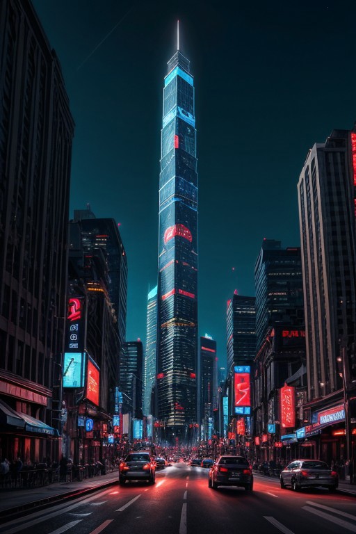 masterpiece, best quality, absurdres, illustration, photorealistic, cinematic, dynamic, science fiction, neon lights, hovering vehicles, towering skyscrapers, advanced technology, digital billboards, night sky
