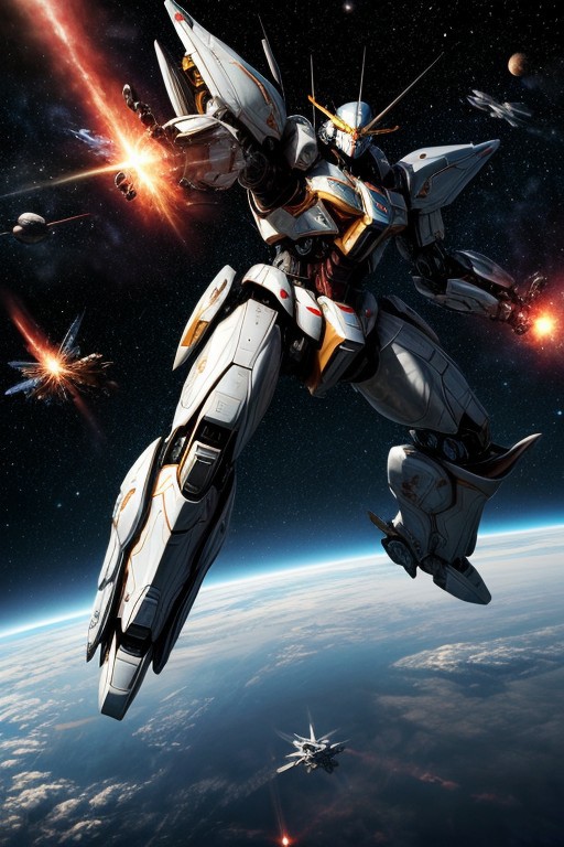 masterpiece, best quality, absurdres, illustration, photorealistic, cinematic, dynamic, mecha, orbital battle, floating in space, starry background, thrusters, cosmic conflict