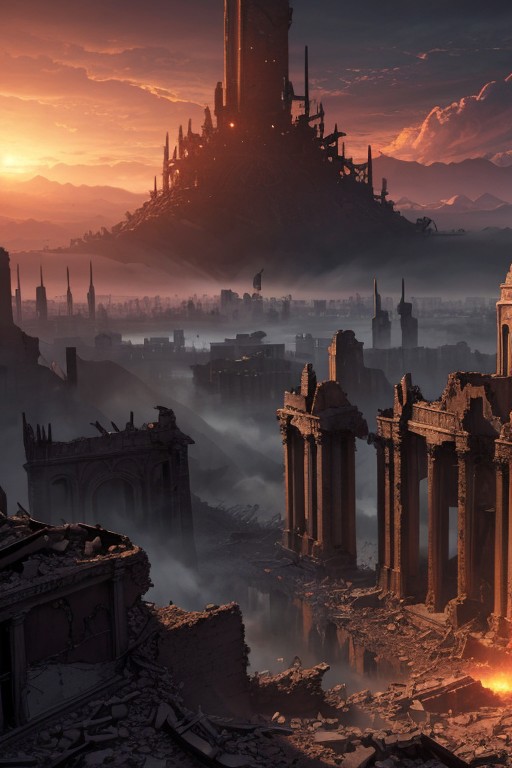 ruined city , earthquake, destroyed building, apocalypse, sunset ,fantasy cinematic ,masterpiece, 8k ,high res,detailed,wandering ,sorceress, magic