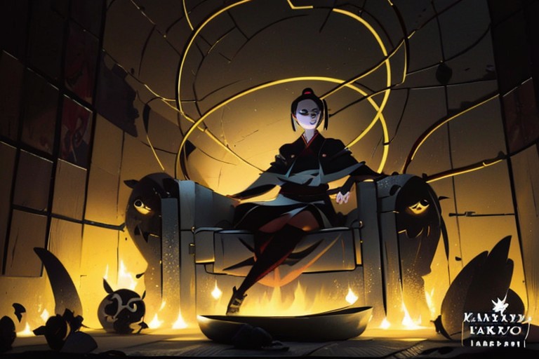 A beautiful futuristic chinese goddess sitting on a throne of different sized skulls glowing with an evil jade glow. Resplendent lighting. Masterpiece, very high level of detail, mysterious atmosphere. Charcoal and ink.