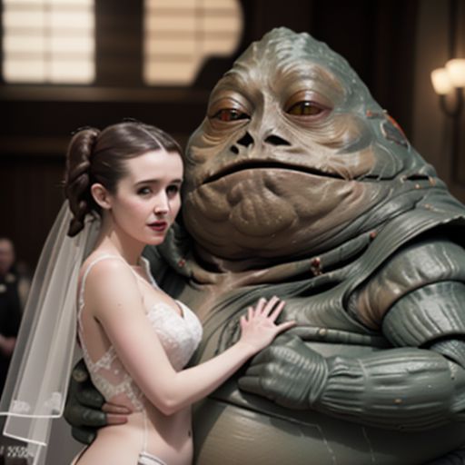Princess Leia, wearing revealing bride attire, at the alter with husband-to-be Jabba the hutt