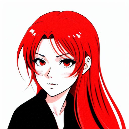 Anime style redhead. white background. Simple lines. Black white red only. Strong dark black lines countourns. Thick strong fat lines.