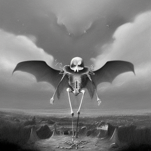 standing, surreal, greyscale, skeleton, blood, cloud, wings, realistic