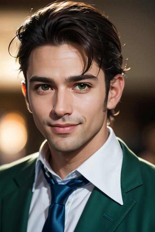 Portrait of Colombian business manager Leandro Restrepo standing in a fashion show: 1boy, solo, age:37, adult, ((male focus)), white skin, brown hair, striaght hair, hazel eyes, thick eyebrows, crocked nose, clean-shaven, shaved, smooth face, green collar shist, green cloth jacket, white necktie, confident smile, (close-up:1.2), realistic, correct anatomy, vibrant colors, masterpiece, sharp focus, best quality, depth of field, cinematic lighting