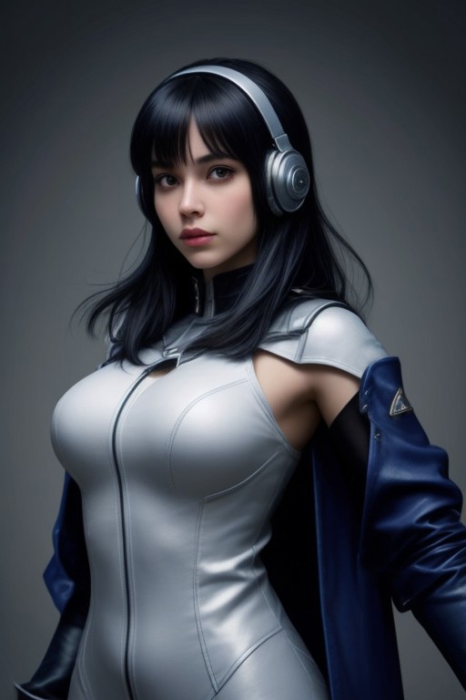 Time Patroller Alex: Female, with long straight dark blue hair and bangs on her forehead. Wearing silver headphones, a black high-collar tight-fitting battle suit, a red sleeveless long coat, black gloves, a silver gauntlet on the left forearm (with an oval sapphire in the center), and a silver beam pistol in the right hand (with a triangle on the front of the pistol head) cone-shaped yellow sapphire). FHD, masterpiece, realistic style.