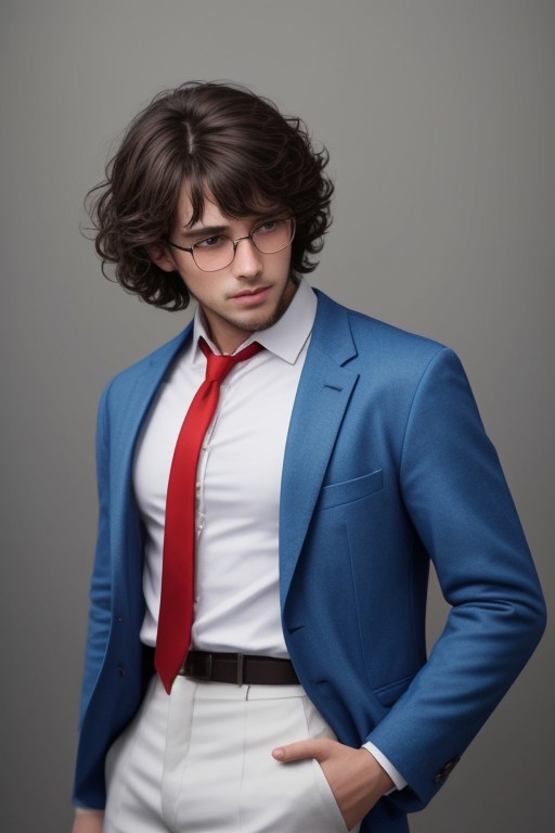 Male, with brown curly hair and bangs parted in the middle of his forehead. Glasses, white shirt, red tie, blue blazer, blue trousers. FHD, masterpiece, realistic style.