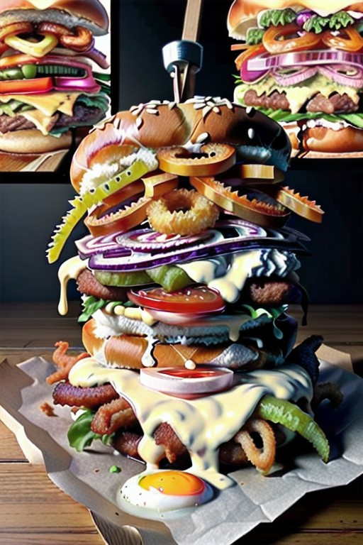 savory, sandwich, meat, cheese, lettuce, fried egg, ice cream, fish, donut, gummy worms, onion rings, pickles, bbq sauce, mayonnaise, pizza slice, various sandwich filling, stacked 6 feet high, dagwood sandwich, (foodporn:1), foodporn, <lora:add_detail:1> <lora:FoodPorn_v2_:1>