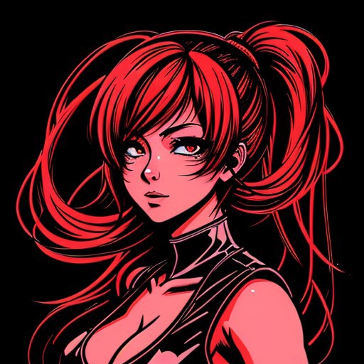 Anime girl. Black and red. Anime style. Duotone only. Black background with shapes. Neon. Thick lines. Heavy strokes. Black strong lines. Red highlights. Unfinished.