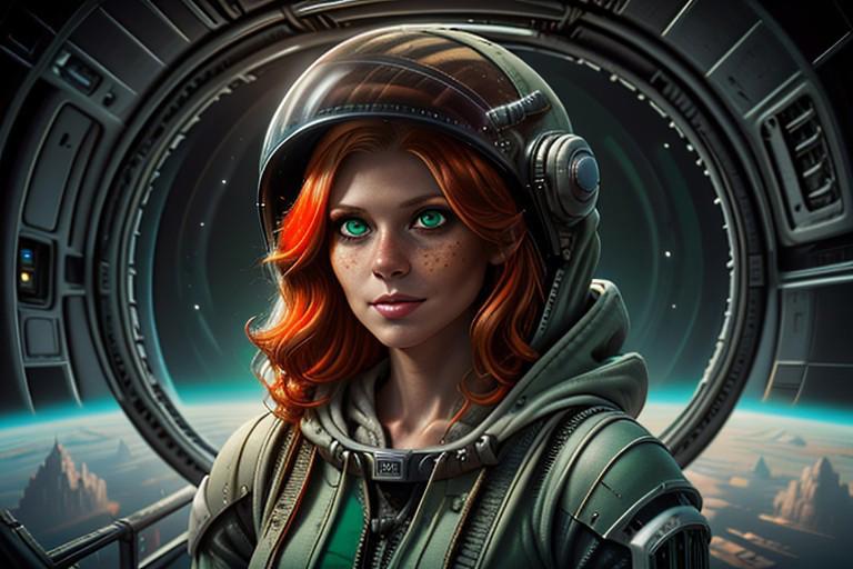 ((masterpiece, best quality)), illustration, graphic novel, sci-fi, horror, fantasy, solo, a beautiful space women, pale green eyes, long wavy ginger orange hair, freckles, (old space station), black eye shadow, looking at viewer, interior space station background with alien vibes, ambient light, wearing an exoskeleton body suit, ((hooded cloak)), clear visor space helmet,