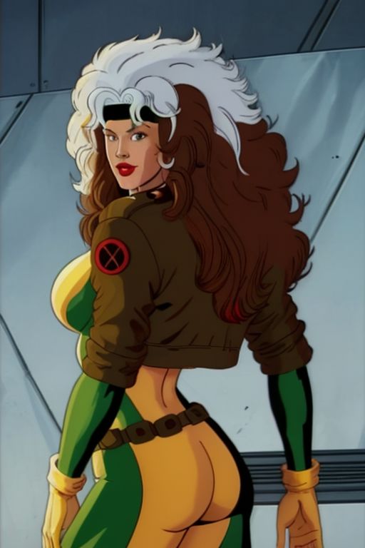 masterpiece, best quality, anime screencap, X-men TaS Style, retro artstyle, cartoon_x_men90s_rogue, x-men, rogue \(x-men\), 1girl,long hair,,brown hair,green eyes,lipstick,makeup,lips, white hair, two-tone hair, green headband, large breasts,messy hair,curly hair, big_hair, jeanswpinktop woman, sexy woman, standing, pink top, pink shorts, looking back, from side, curvy, breasts, midriff, thighs, long hair, evil smile, looking at viewer, <lora:jeanswpinktop:0.75> <lora:XmenStyle:0.8> <lora:CARTOON_X_MEN90s_Rogue:0.5>