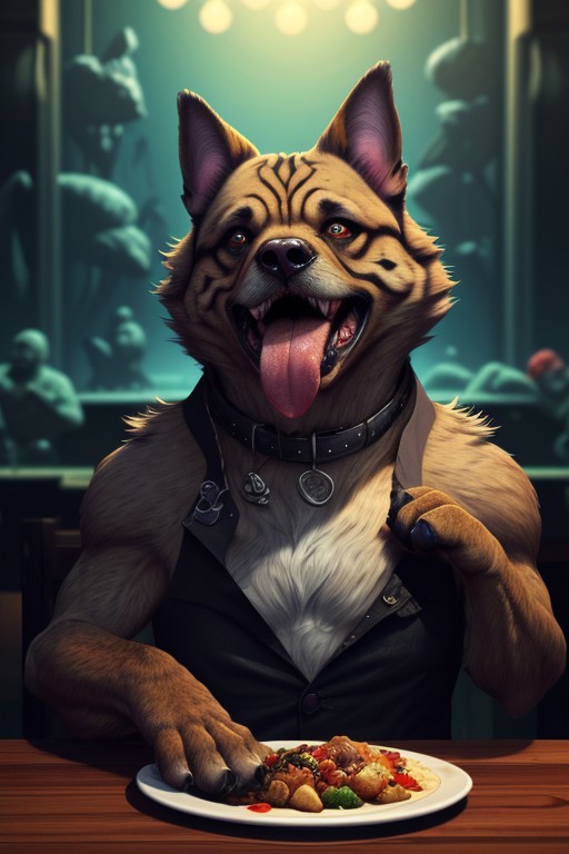 long_tongue, c4tt4stic, An old dog dressed up in a tutu, sitting at a table in a fancy restaurant having dinner (with his feline friends). Tongue hanging out, Hyper realistic extremely detailed, aquarium back ground, dark, moody, sad