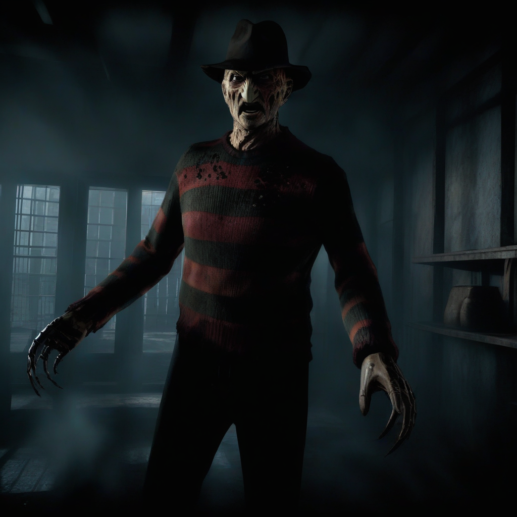 Ultra-realistic extremely detailed 8k photo of an open world horror game as scary nightmare demon FreddyKrueger, standing in the middle of the room, breathtakingly amazing artwork, beautiful composition, gorgeous and haunting lighting ((adult)), full shot, <lora:fatal style:0.8> fatal style, video game, night, horror, scary, creepy <lora:FreddyKrueger:1>