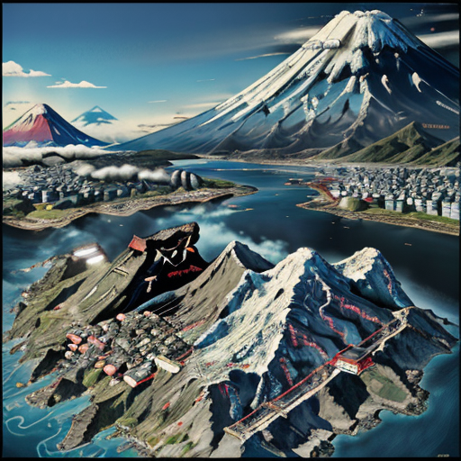 painting of a city map, vivid colors, maximalist, highly detailed, small buildings, rocky fjord, wooded hills, blue sea, farmland, viking longhouses, stone keep, norse motifs, knotwork decoration, harbor, longships, small scale, edo, tokyo, (Fujiyama,Mount_Fuji: 1.5)