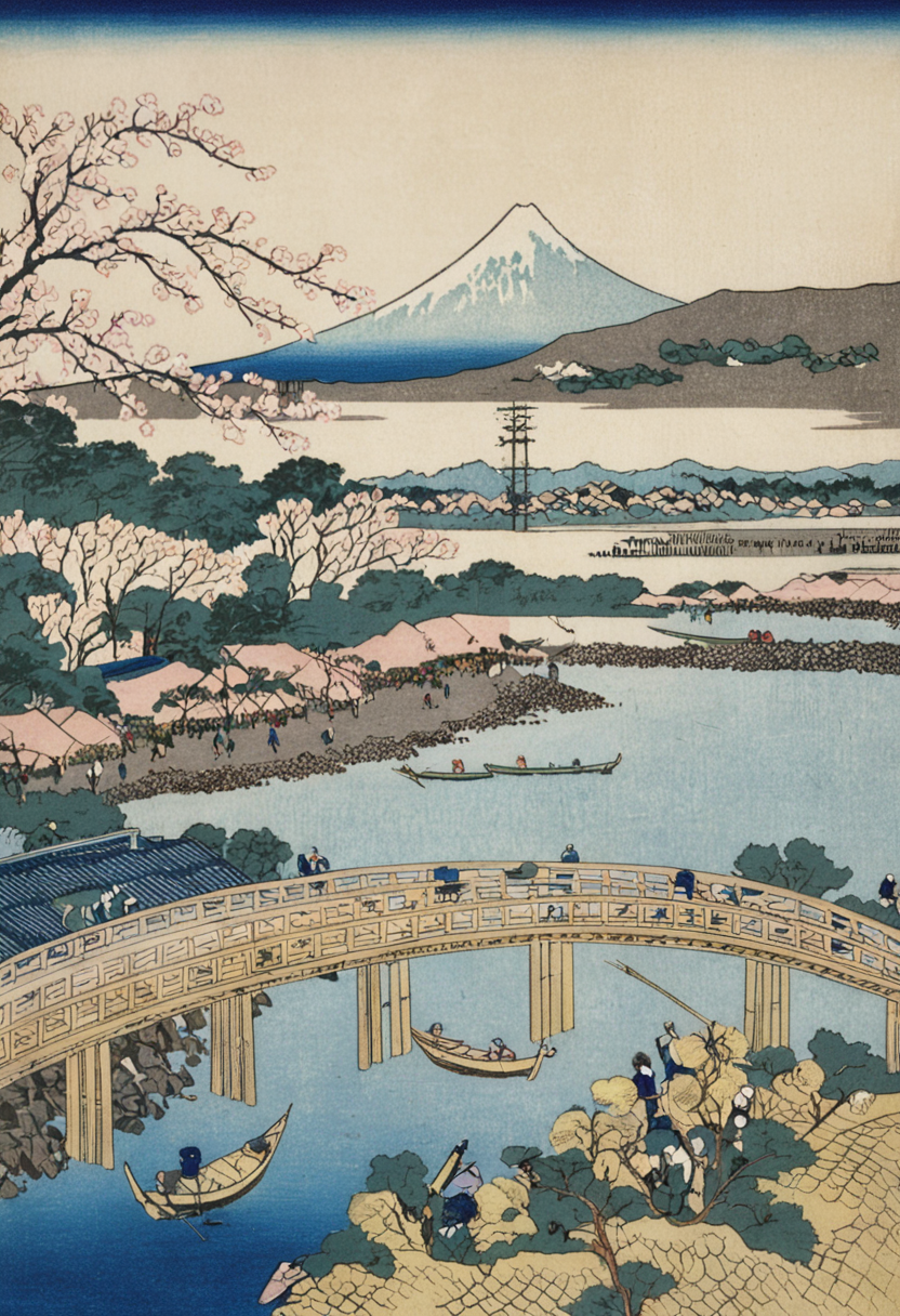 wooden arch bridge, river, crowd, mount fuji, boats, cherry tree, scenery, outdoors, (best quality), highly detailed, KHsty-XL <lora:KHsty-XL-v3-000020:0.9>