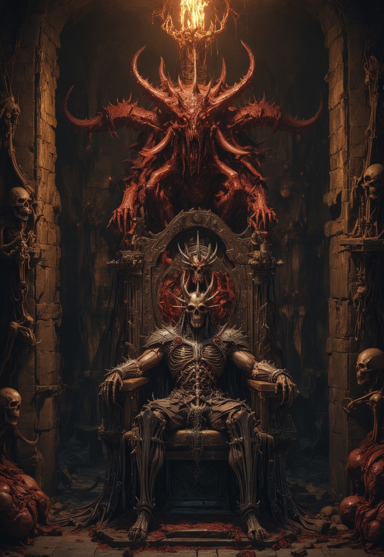 ((an eldritch horror demonic king sitting on his throne in a dark medieval torcher chamber in the depths of hell:1.6)), toned body, detailed skin shading, intense lighting, light bloom, light leaks, harsh highlights, bosstyle, ( detailed, intricately detailed, extremely detailed, dark, frightening, stunning, epic, (sharp focus:1.5), (torcher devices, iron maiden, rack, implements, meat hooks, skin flayers, whips, chains, spiked chair, cages, spinning blades, guillotines, skeletons, corpses, blood, flesh, limbs:1.4), grimdark, horrific, disturbing, grotesque, disgusting, ), BREAK, masterpiece, absurdres, intricately detailed, highest quality, official art, official wallpaper, 4k, 8k, UHD, HDR, mixed media, lineart, digtal art, hyperdetailed realistic illustration, hyperrealism, detailed shading, ray-traced, soft shadows, complementary colors, (vibrant colors, colorful palette:1.2),